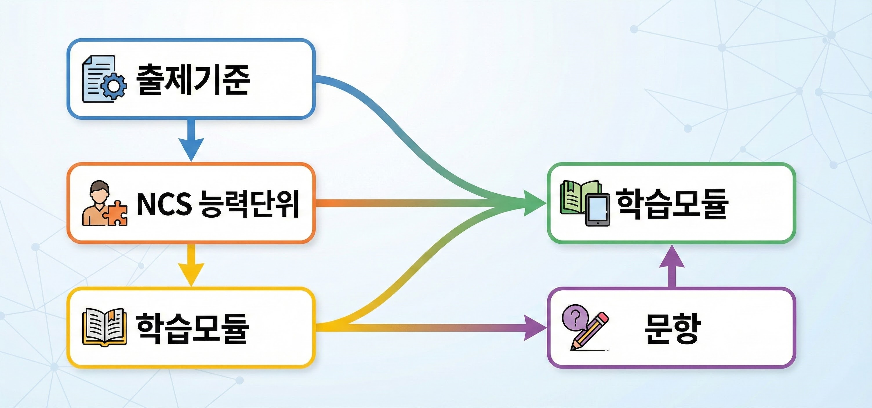 출제기준·NCS·학습모듈 3중 매핑 + 오답 기반 추천으로,